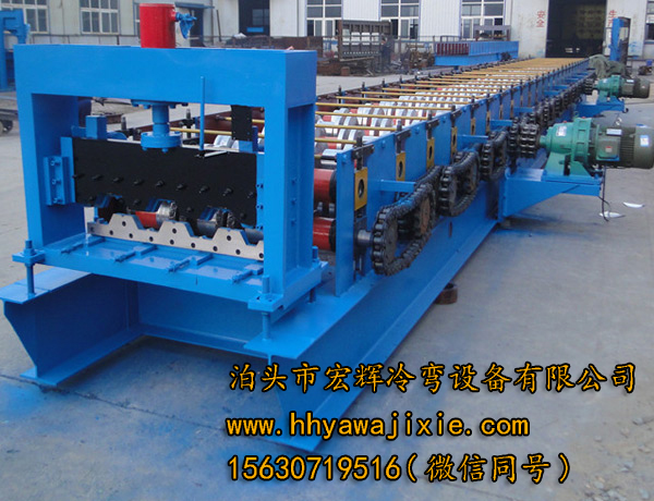 688樓承板成型機(jī)采用.液壓驅(qū)動(dòng),成型后自動(dòng)尺切斷,不變形,無(wú)廢料,安全系數(shù)較高(主機(jī)停切斷)。