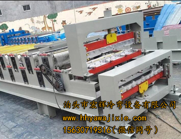 (2)為了滿意在有限的場地面積上成型兩個斷面的需要,能迅速地變換產(chǎn)品,壓瓦機(jī)雙層軋機(jī)(雙層彩鋼瓦成型機(jī),雙層一體設(shè)備)也被設(shè)計(jì)制造出來,這種雙層彩鋼瓦成型機(jī)是在高或低機(jī)架之間變換,生產(chǎn)一種輪廓的彩鋼板安裝在低機(jī)架上,生產(chǎn)另一種板型的軋輥安裝在高機(jī)架上面,生產(chǎn)線有一個開卷機(jī),一個割斷壓力機(jī),如果彩板喂入低層軋輥,成型一個板型(如平房用披又疊板)如料卷喂入高層的軋輥,而成型另一個斷面(層面板)。